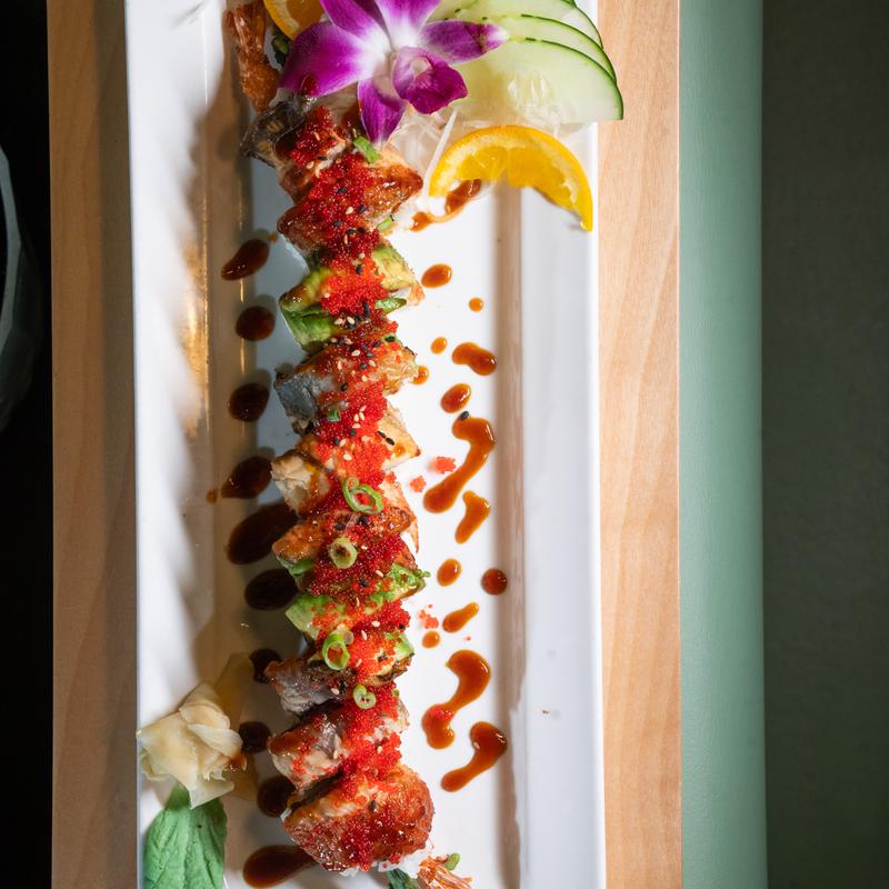 Battered salmon, eel, asparagus, cream cheese, masago, sesame seeds, scallion, sriracha, shrimp sauce, teriyaki, and sesame seeds.